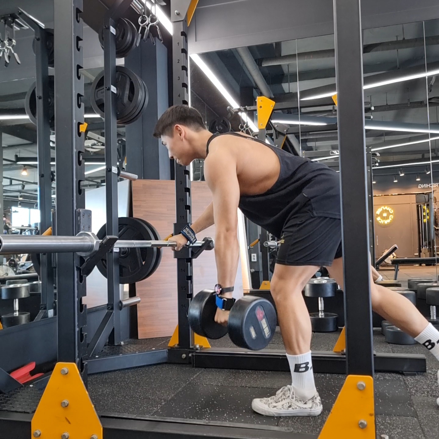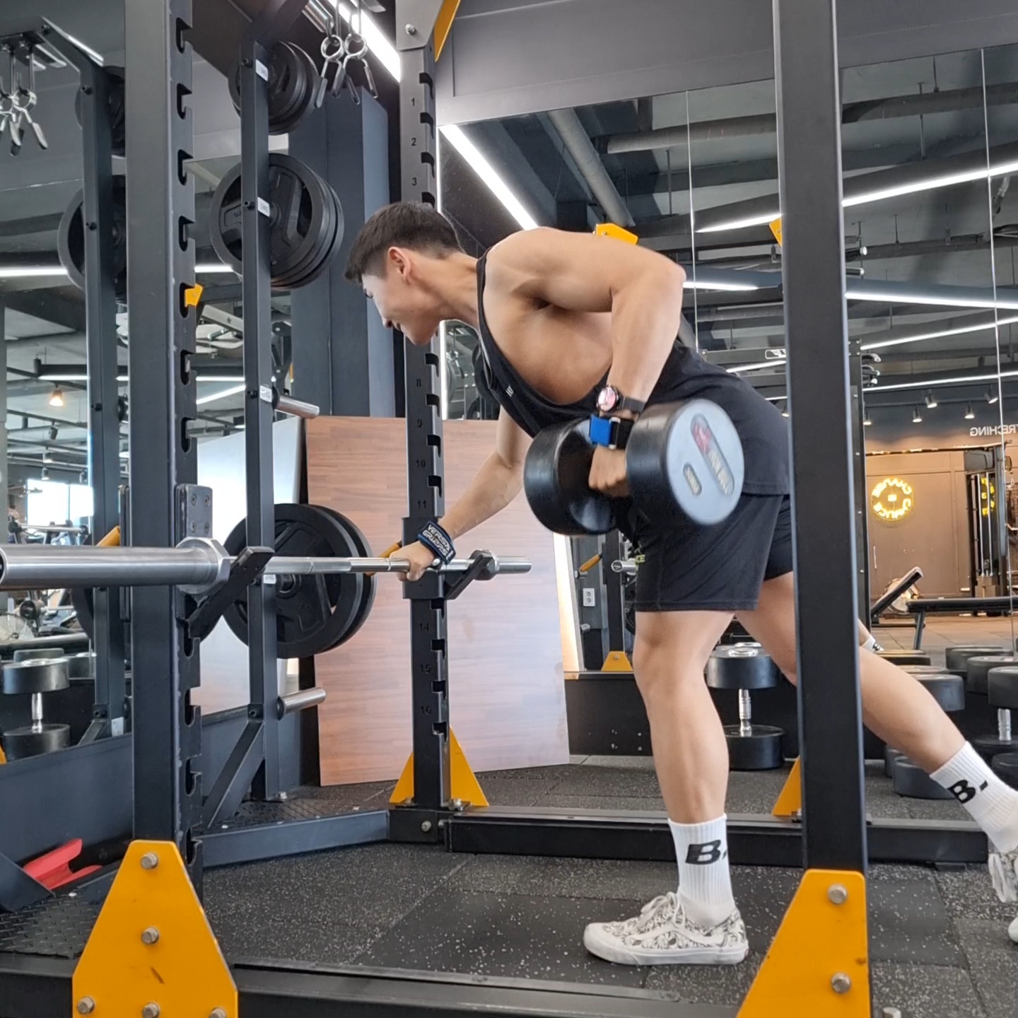 오늘 제가 알려드릴 방법은 렉에 바를 잡고 숙인상태에서 덤벨로우를 진행하는 방법을 알려드리려 합니다 :)